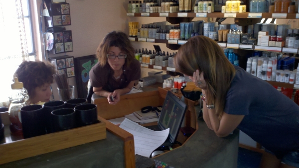 Inside was the most unusually decorated hair salon she had ever seen. Large free form mirrors adorn the walls in front of cushy salon chairs. A thermos of coffee and/or hot tea at the reception area communicates that this is a place to relax and, uh, let your hair down. A disc jokey in the back pumps a continuous selection of relaxing contemporary music into the salon.